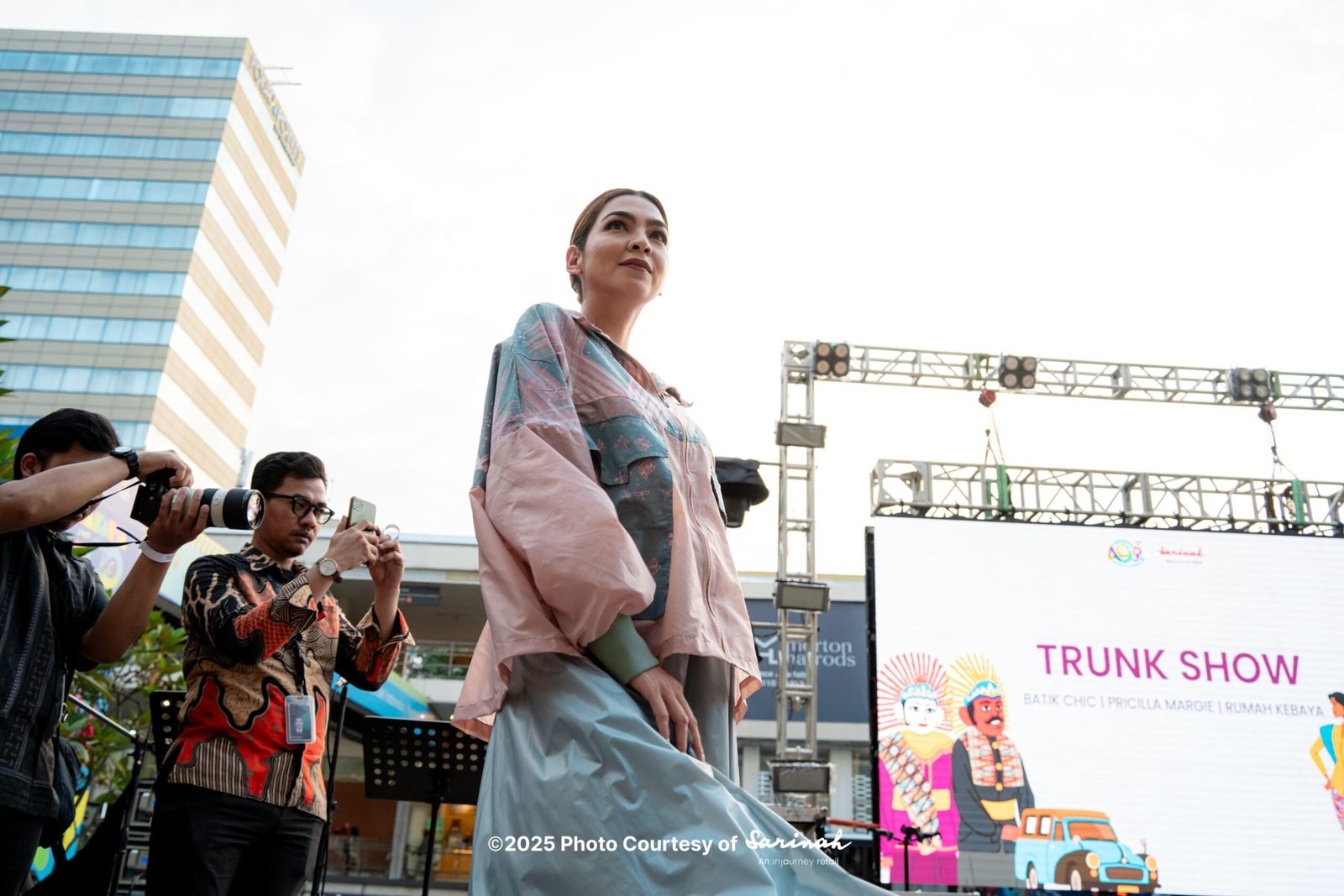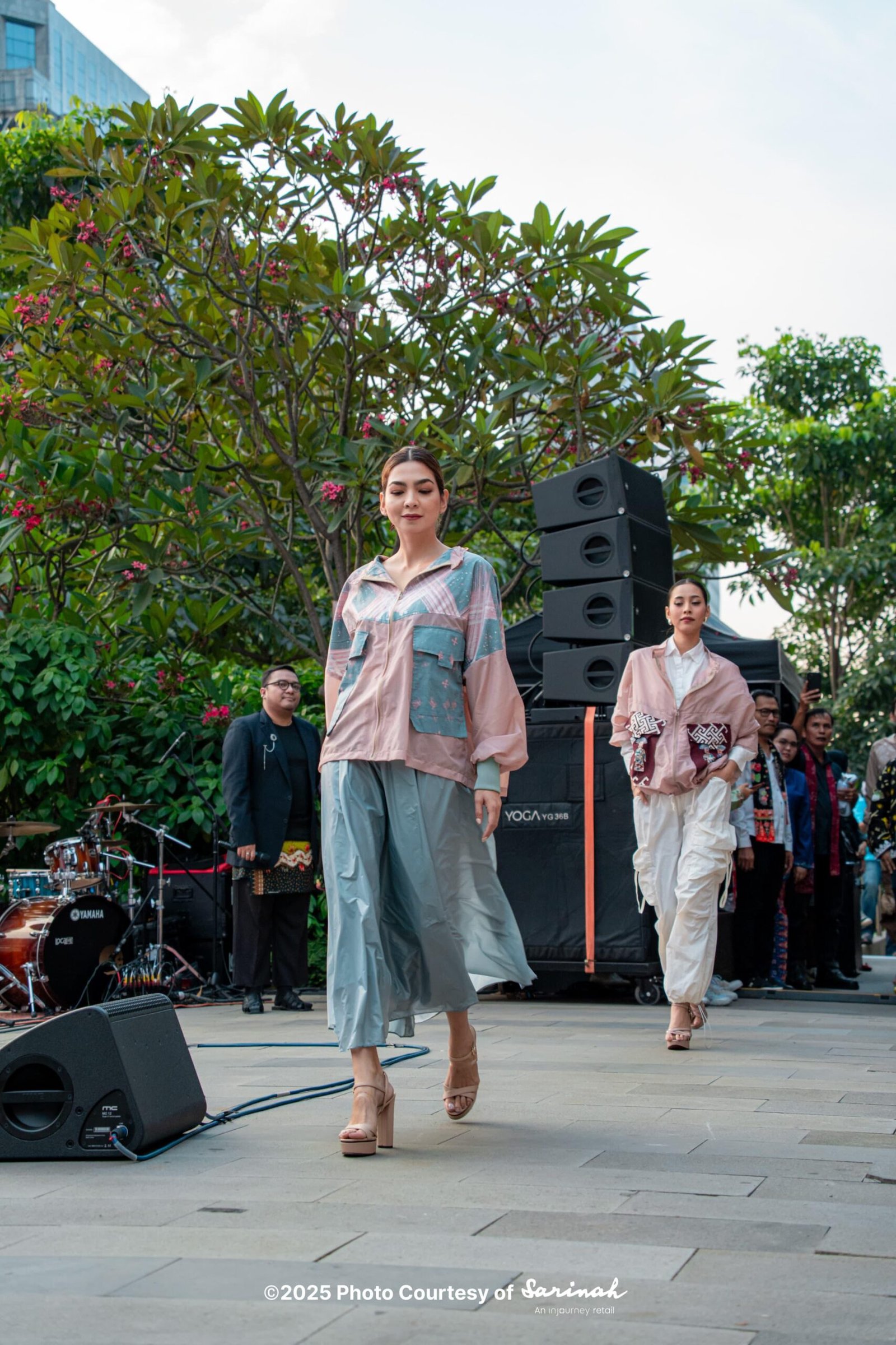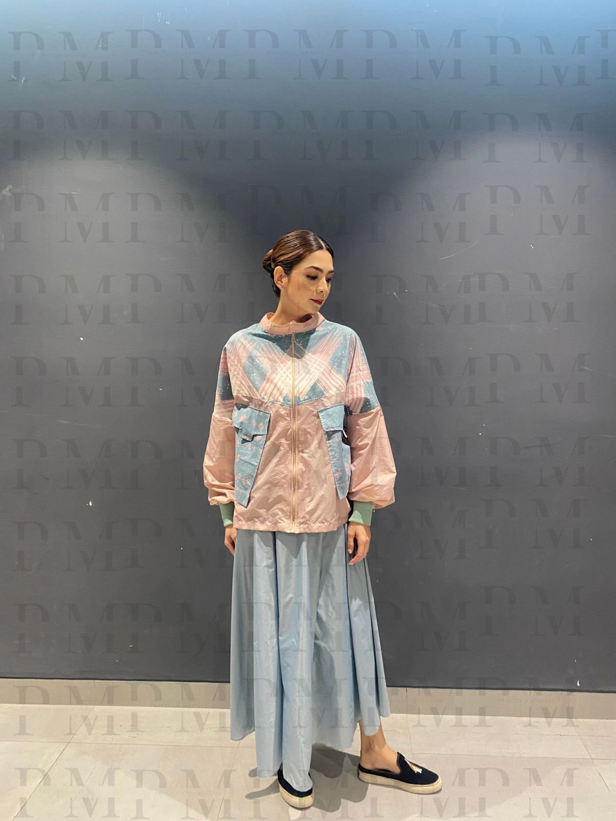 Jaket zip-up berwarna dusty pink dengan aksen motif batik kontemporer pada bagian depan, berbentuk pita horizontal yang memanjang ke saku depan. Jaket memiliki kerah tinggi dan saku flap dengan kancing, serta manset abu-abu yang memberikan kesan sporty namun tetap elegan.