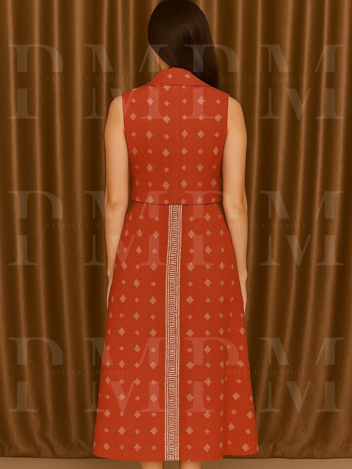 Warna dasar merah bata berpadu apik dengan motif batik kontemporer berwarna putih, sementara aksen kerah lebar dan kancing dobel baris (double-breasted) memberikan sentuhan gaya militer yang modis dan elegan. Blazer ini tidak hanya fungsional, tapi juga menjadi statement piece dalam tampilan Anda.