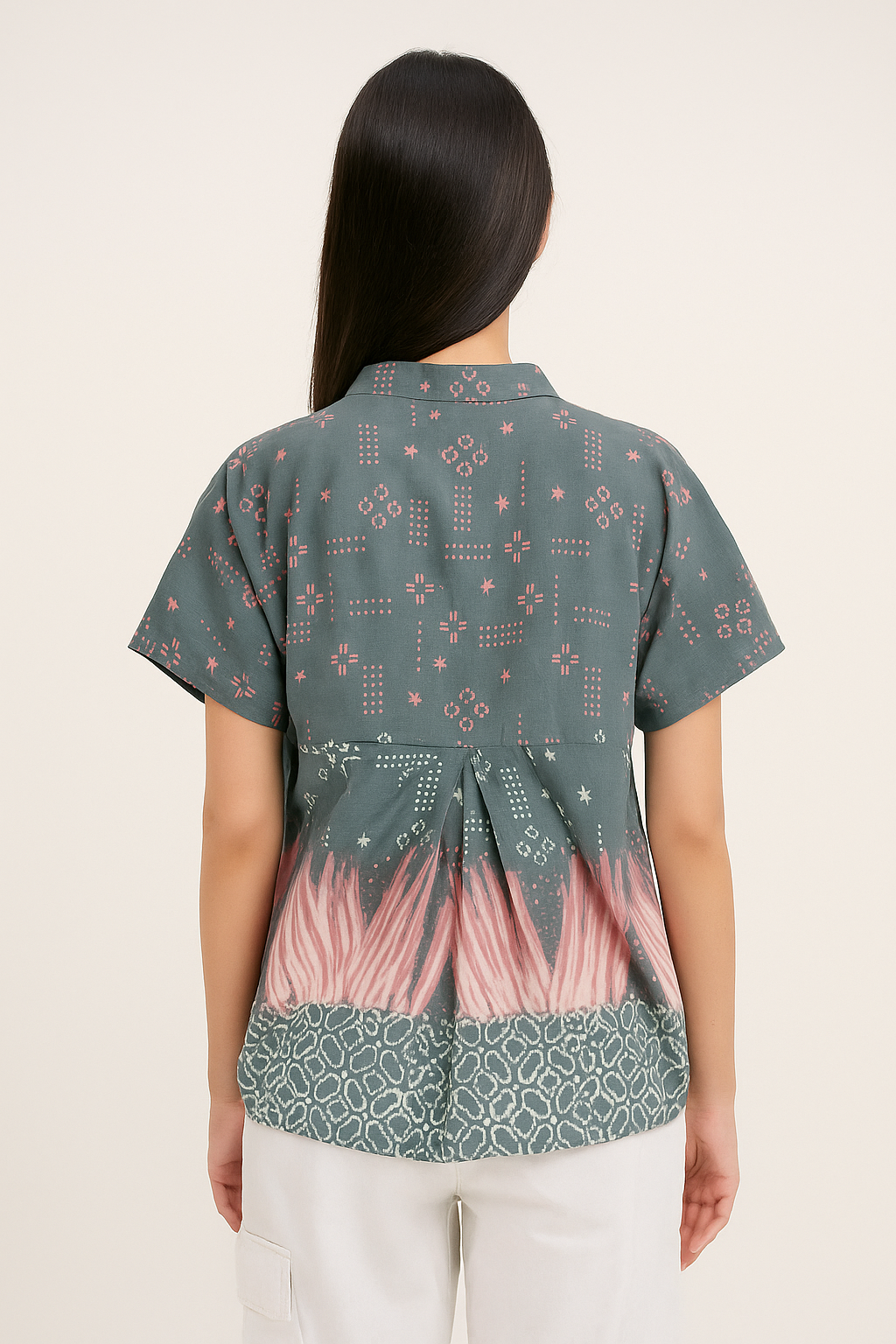 Atasan Bomber resleting dengan lengan pendek berbahan ringan. Motif batik print berpadu warna hijau army dan aksen peach, dilengkapi detail serut di bagian bawah.