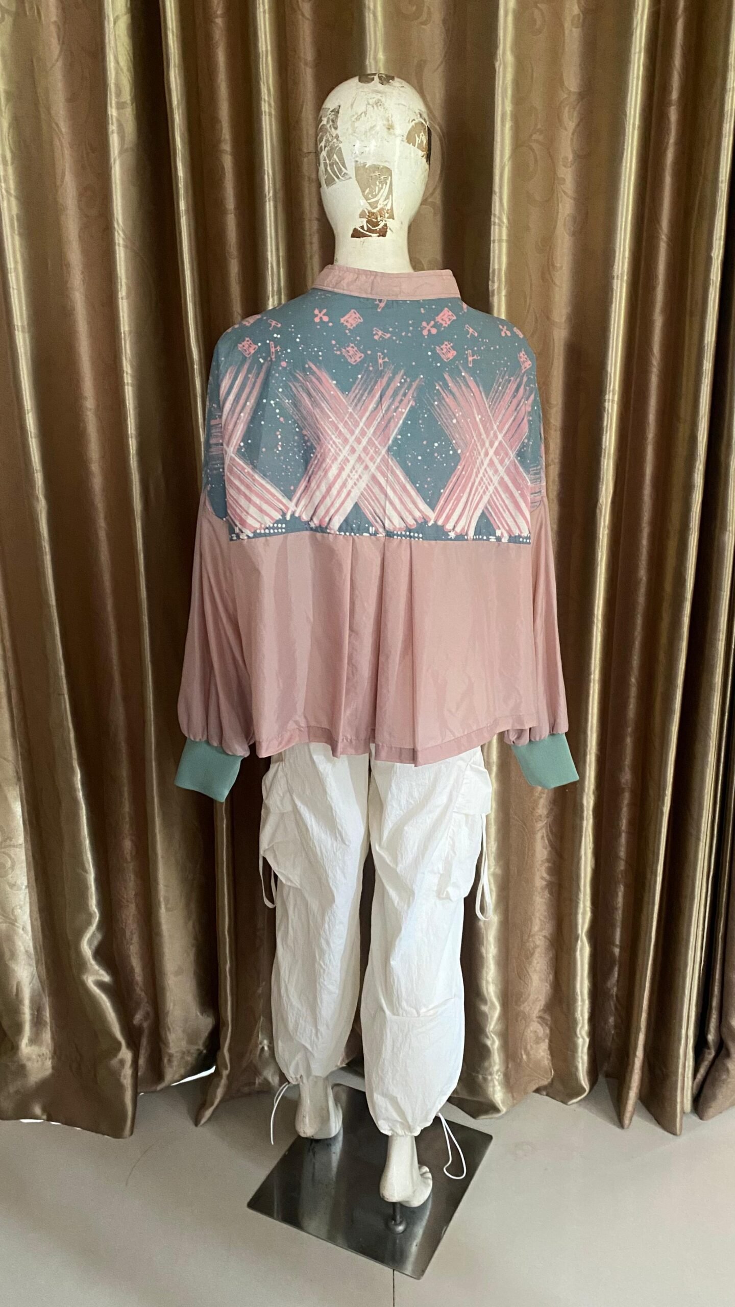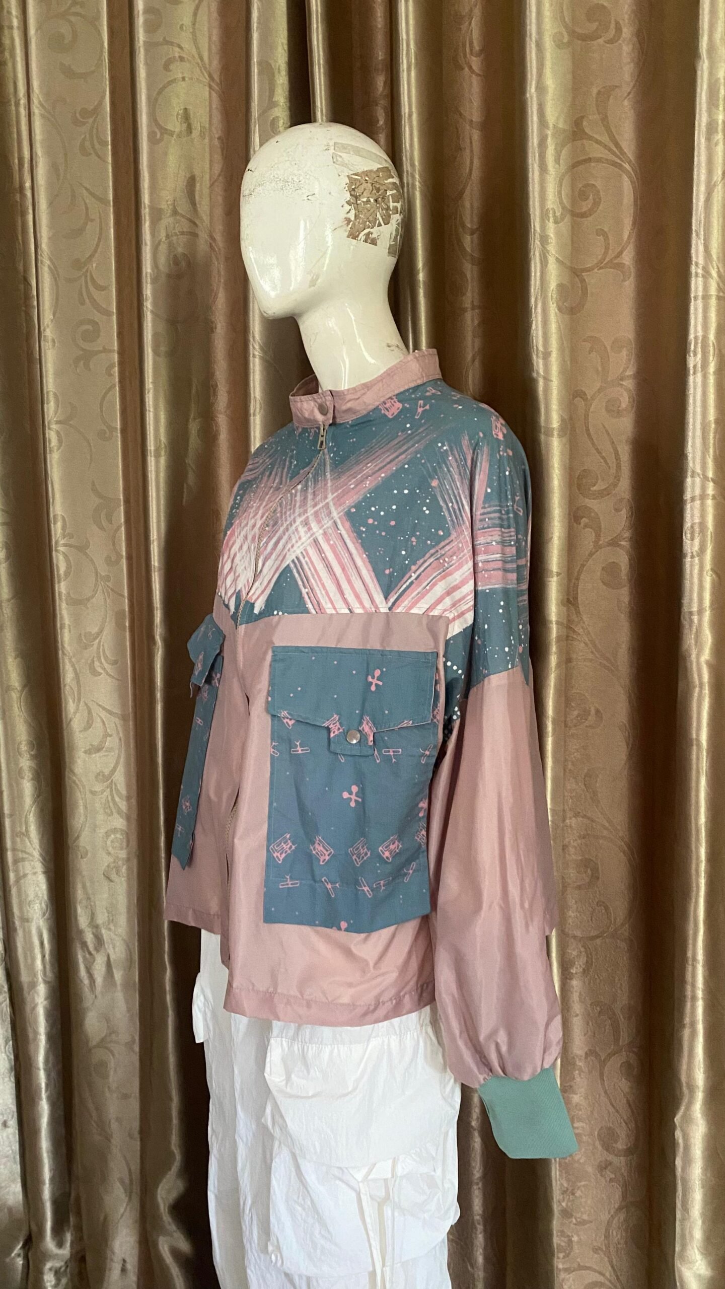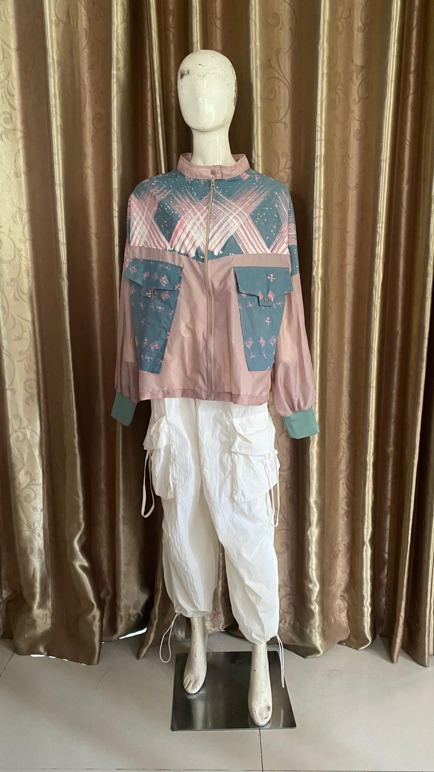Dibalut dalam nuansa pastel yang kalem namun berkarakter, bomber ini menghadirkan tampilan modern yang sarat nilai artistik. Terbuat dari kombinasi parasut premium ringan dan potongan kain bermotif etnik berwarna dusty pink dan biru langit, bomber ini tampil sebagai statement piece yang effortless.