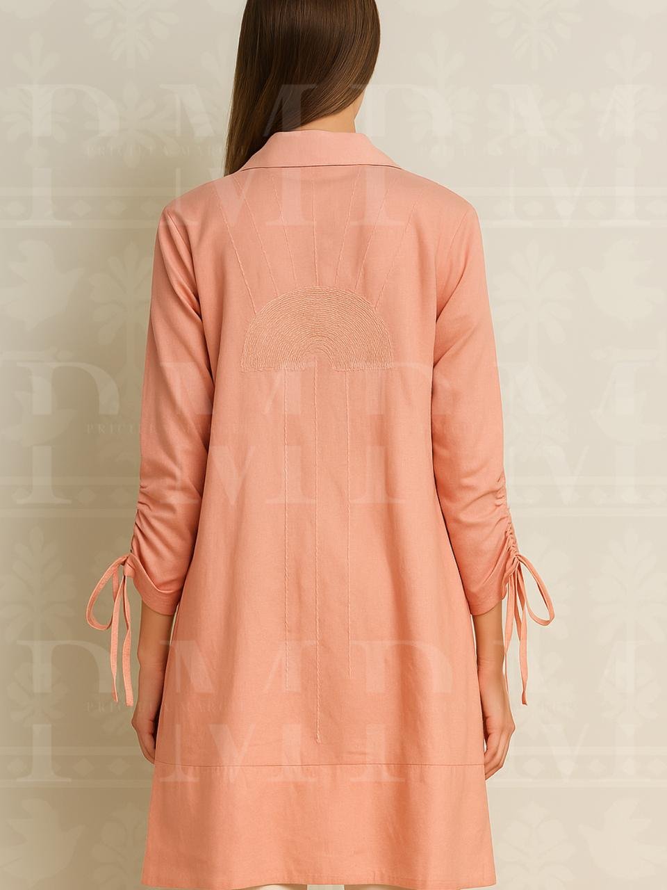 Outer linen bernuansa peach dengan detail saku serut yang unik. Desain minimalis namun tetap berkarakter, cocok untuk acara casual hingga formal.