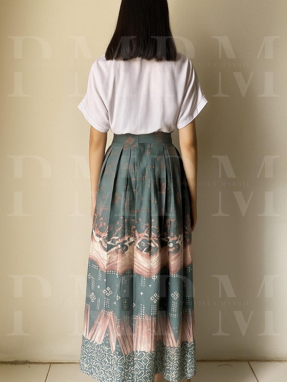 Rok panjang etnik dengan lipit rapi, menampilkan warna hijau sage yang lembut berpadu motif pink-putih yang elegan. Desain etnik modern ini memberikan sentuhan feminin yang anggun sekaligus sophisticated.